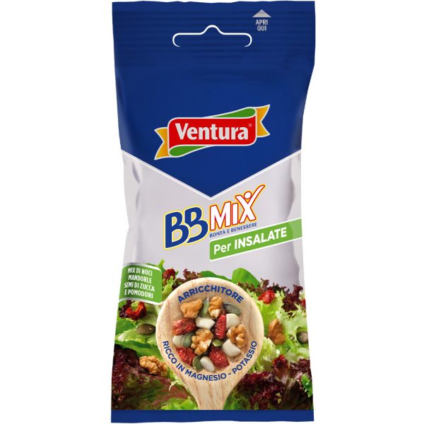 Scopri come funziona il programma fedeltà Ventura!Esiste un modo facile e originale, per dare sprint a qualsiasi insalata: il BBMix per insalate a base di Frutta Secca Ventura, con granelle di Noci e Mandorle, Pomodori essiccati e Semi di Zucca! È una originale miscela con Frutta Secca pensata per dare sapidità e carattere a contorni e piatti freddi. Usa questo BBMix per insalate, ricco di Magnesio, a casa o… ovunque ti porti il tuo appetito. È disponibile in due formati: pocket (42 grammi), comodo da tenere in borsa e nello zaino, e maxi (150 grammi), per non restare mai a corto di Bontà e Benessere Ventura.