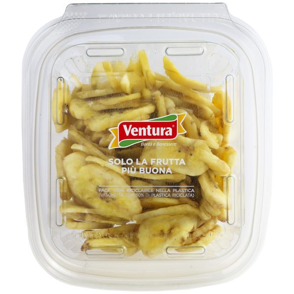 Scopri come funziona il programma fedeltà Ventura!Compra online Banana chips Ventura e rendi speciali i tuoi happy hour! Al posto di popcorn e patatine, sgranocchia queste golose chips di Banana essiccate, non fritte, dolcificate con zucchero di canna, senza conservanti. Fai scorta di Banana essiccata a fette Ventura, grazie alla comoda vaschetta richiudibile da 100 grammi, 100% riciclabile nella plastica e realizzata per il 50% con plastica riciclata. Prova questo snack esotico anche come ingrediente speciale della tua bevanda calda preferita!